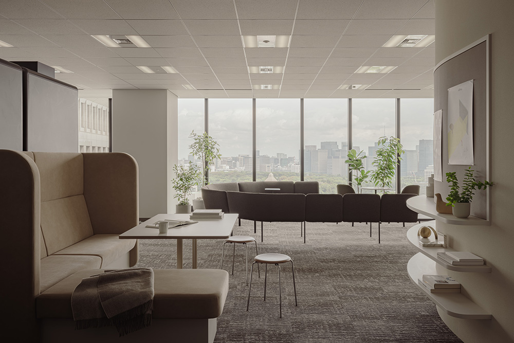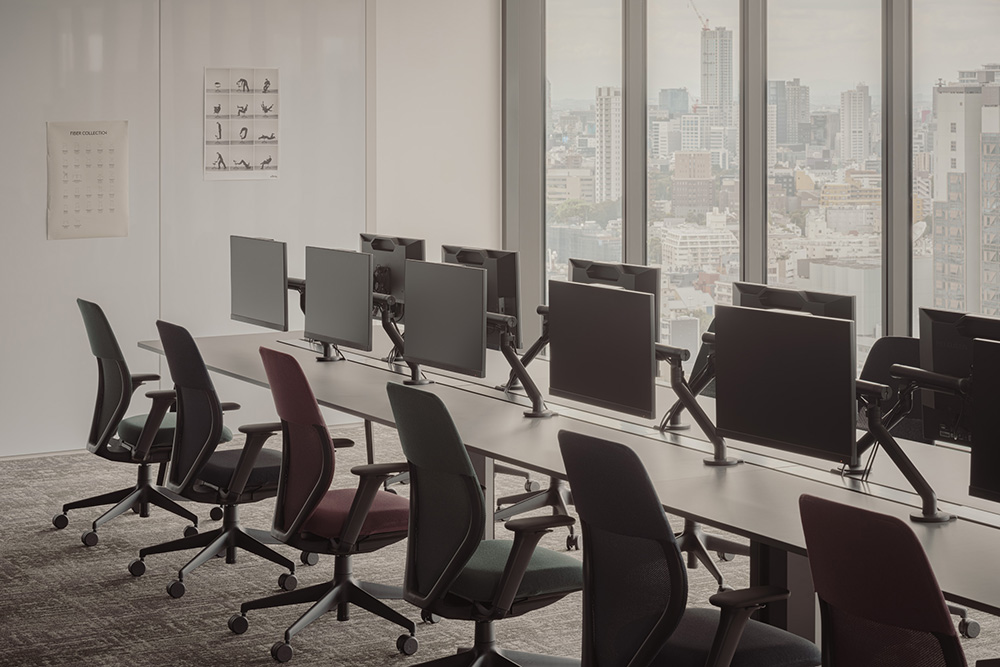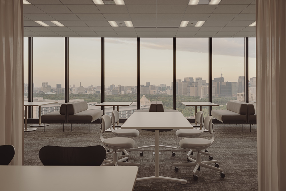 The work area is planned with simple and easy to navigate zoning. Private rooms and back-of-house functions are kept compact, allowing for a generous open workspace. Long-span workstations are placed along the building core to offer enough seating capacity. Along the windows, we arranged areas for focused work, open meetings, and lounge activities to support a variety of work styles. Booth furniture and curtains help provide privacy while maintaining an open atmosphere.
