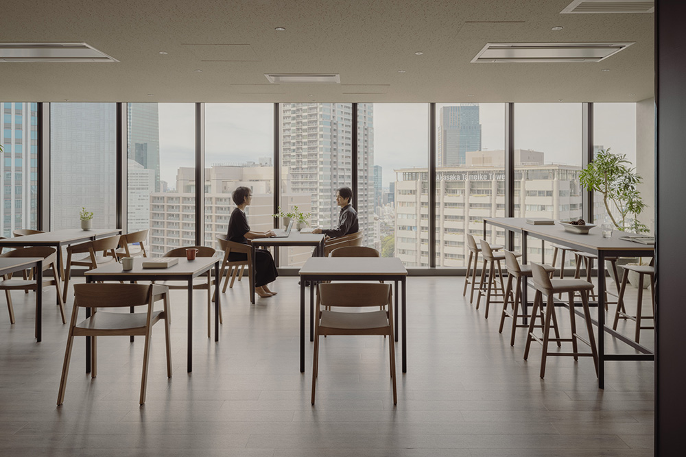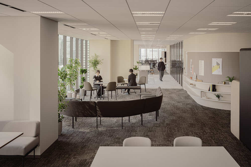 The work area is planned with simple and easy to navigate zoning. Private rooms and back-of-house functions are kept compact, allowing for a generous open workspace. Long-span workstations are placed along the building core to offer enough seating capacity. Along the windows, we arranged areas for focused work, open meetings, and lounge activities to support a variety of work styles. Booth furniture and curtains help provide privacy while maintaining an open atmosphere.