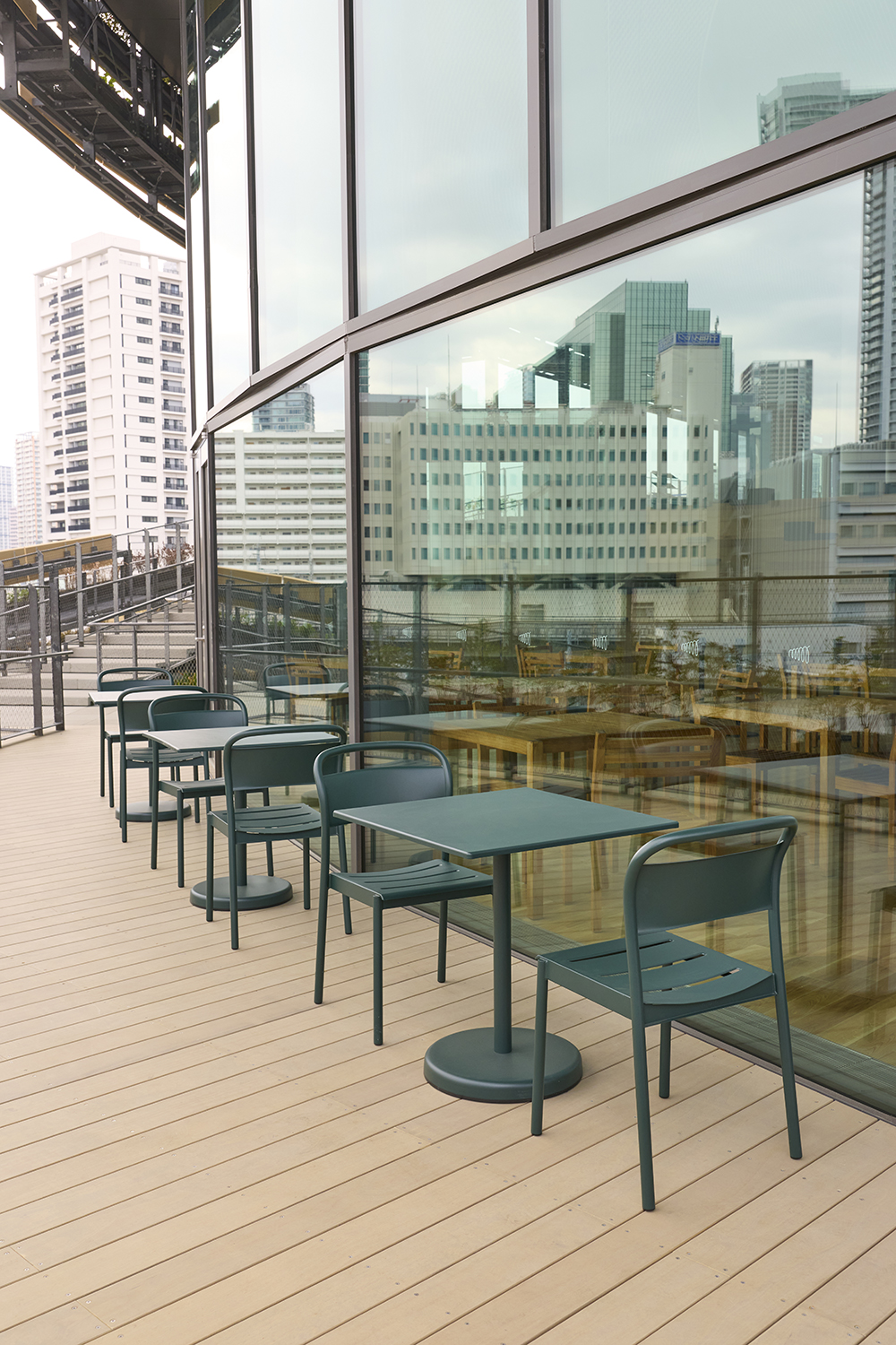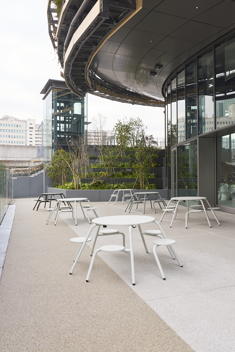 また、大阪・関西万博で使用された家具をリユース品として導入し、循環型の取り組みを実現しました。1階のMon Park Cafeでは、スイスパビリオン「ハイジカフェ」で使用されていたヴィトラの家具を採用。3階のMon Kitchenでは、北欧パビリオンのルーフトップテラスで使用されていたカール・ハンセン&サンのアウトドア家具を取り入れています。さらに、インターオフィスにてリペアを施した家具を再活用することで、持続可能な循環サイクルの構築にも寄与しました。