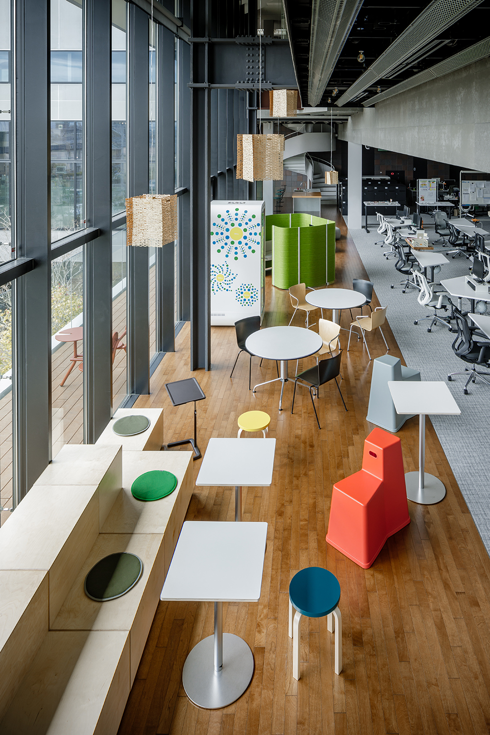 香川と岡山をエリアとするテレビ朝日系列局 KSB瀬戸内海放送の新社屋新築プロジェクト。インターオフィスは、エントランス・コワーキングエリアのデザイン家具を担当した。コワーキングエリアが至るところに点在し、部門間のボーダレスなコラボレーションを促すように心掛けた。歩くことで交流し、対話と協働のスペースが自然と生れるフロア計画となっている。