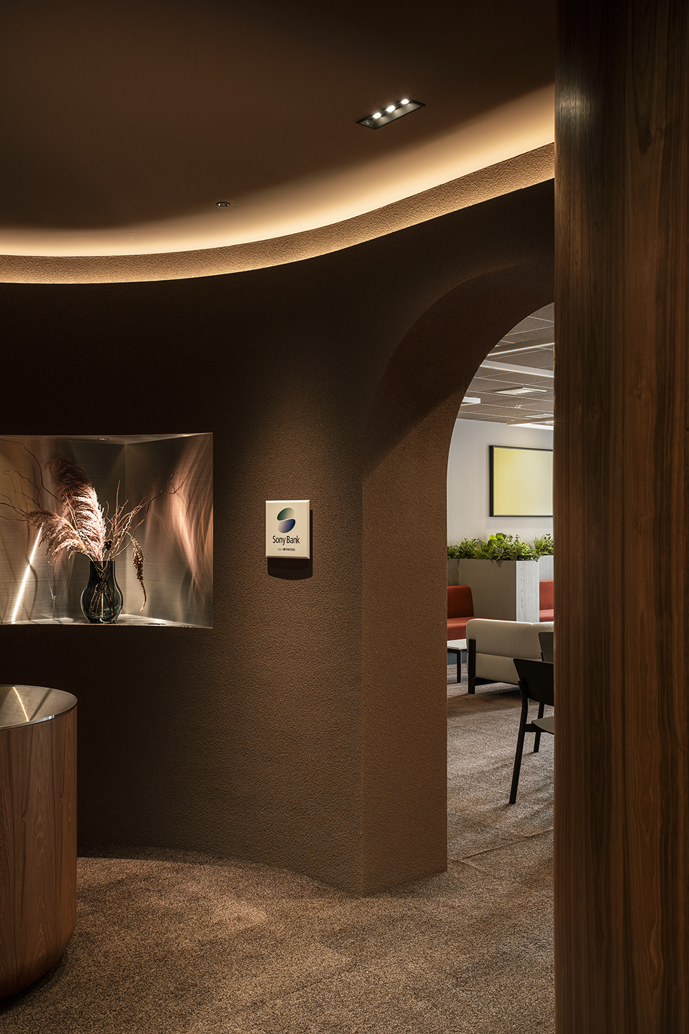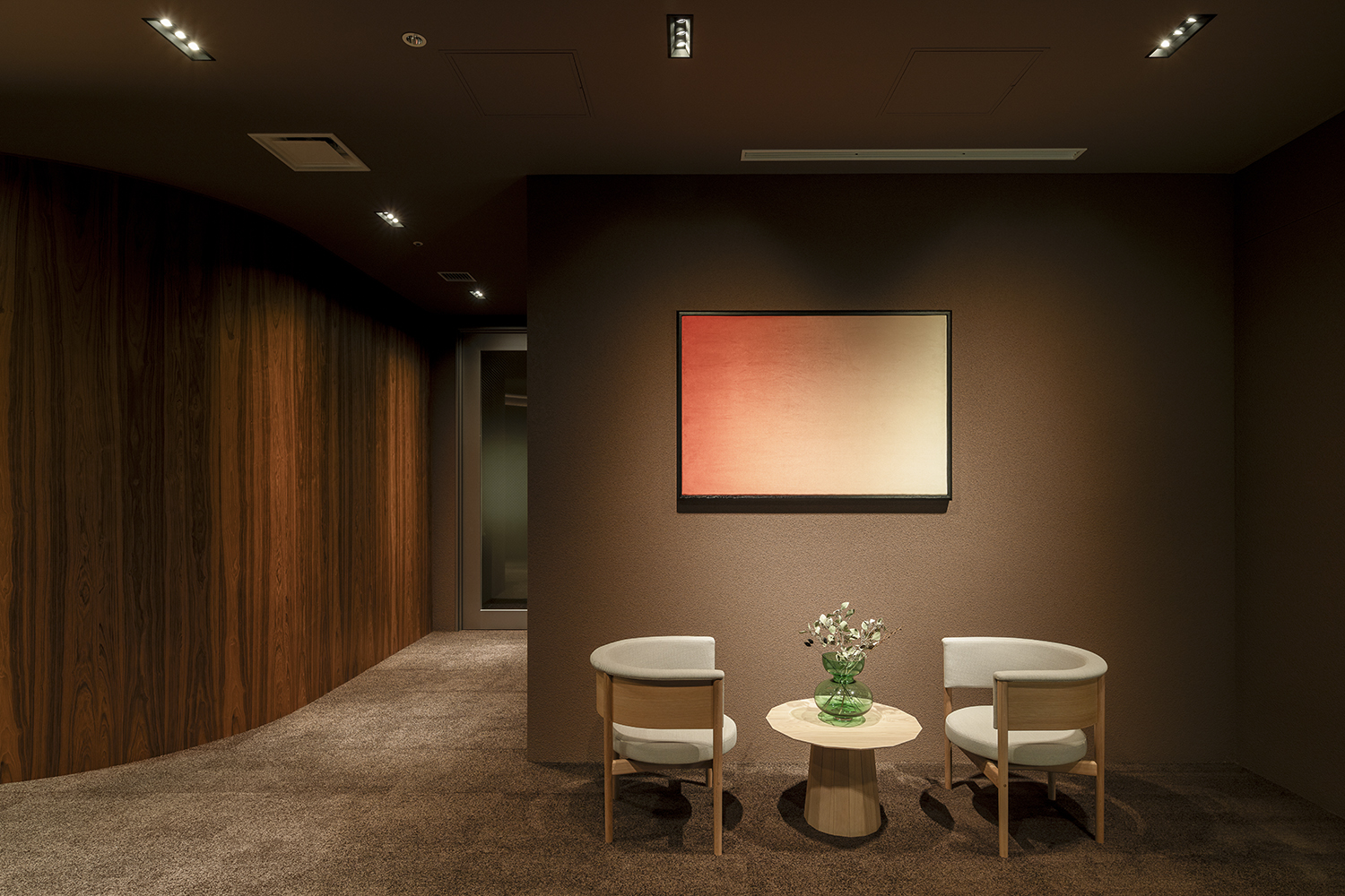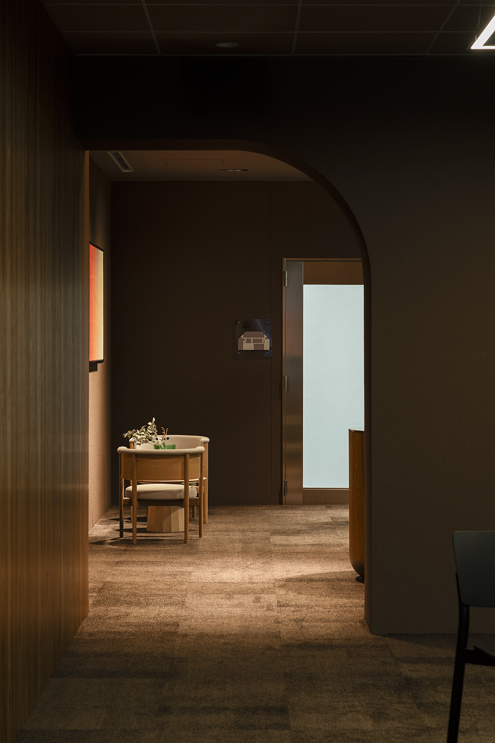 空間全体は深みのあるブラウンのトーンでまとめ、落ち着きと品格を演出しました。やわらかな曲線の要素を随所に取り入れることで、視線や動線が自然に導かれ、緊張をほぐす心地よい流れが生まれています。