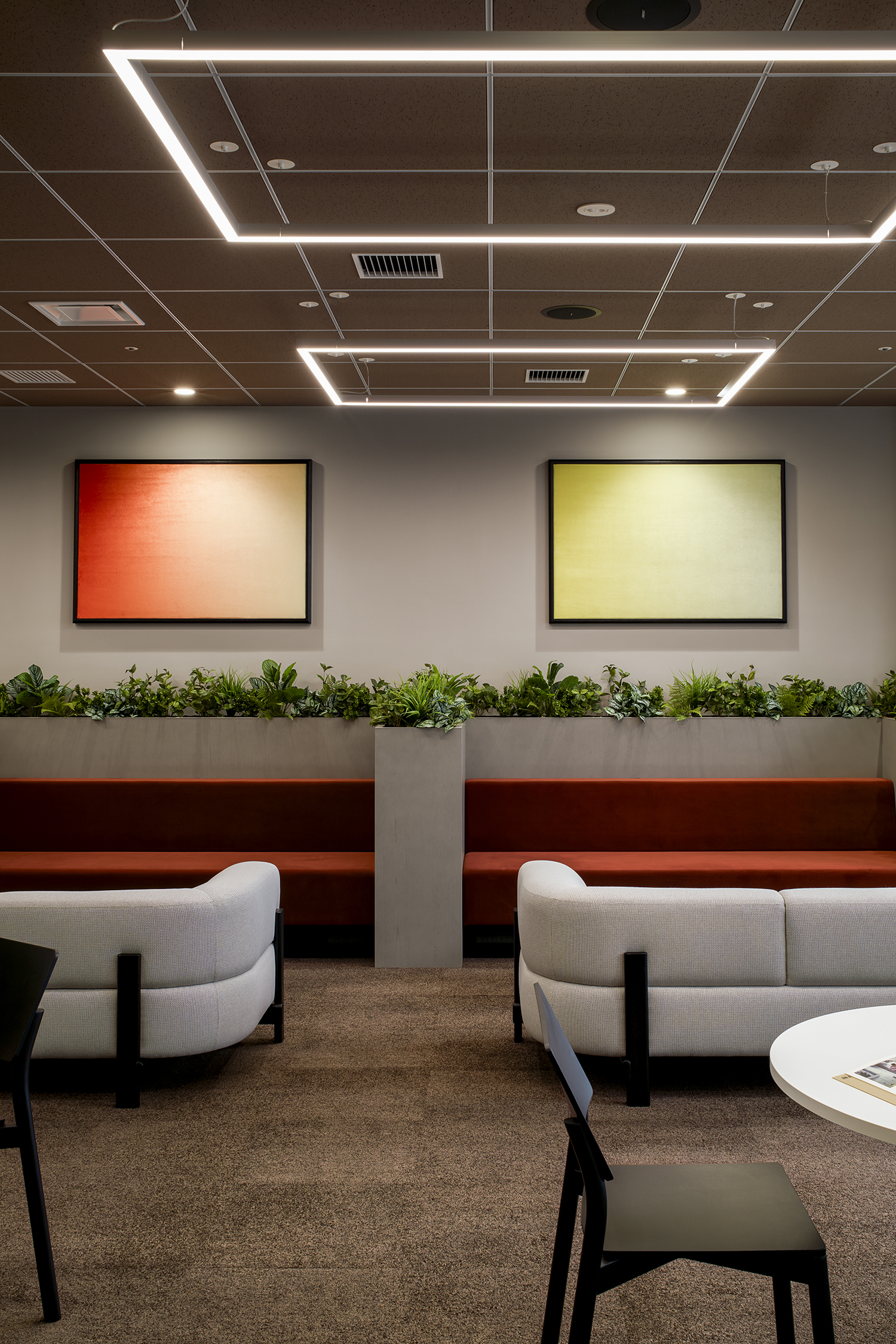 家具は対話を重視したレイアウトとデザインを採用。ゆったりと向き合える配置とすることで、人と人との程よい距離感を保ちながら、自然な会話や交流が生まれるよう工夫しています。また、ラウンジの“顔”となるエントランスには、洗練された品格を持たせ、訪れる人に安心感と信頼感を与えるよう配慮しました。