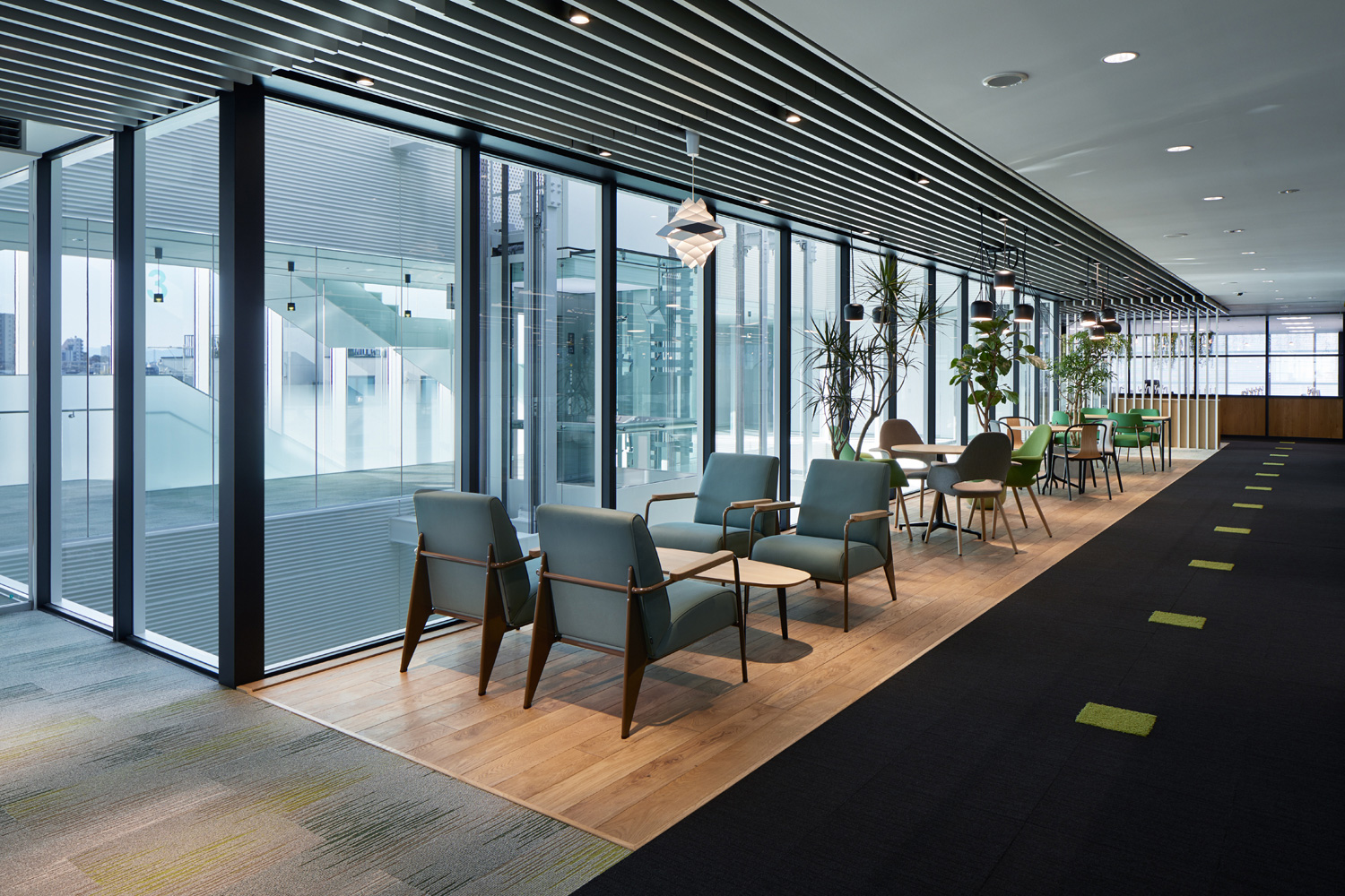 タテとヨコの動線を活かしたゾーニングで、部署間やフロア間をまたいだコミュニケーションやコラボレーションが生まれるレイアウトとなっており、さまざまなテーマを持ったオフィスデザインは働く人たちの感性を刺激している。
