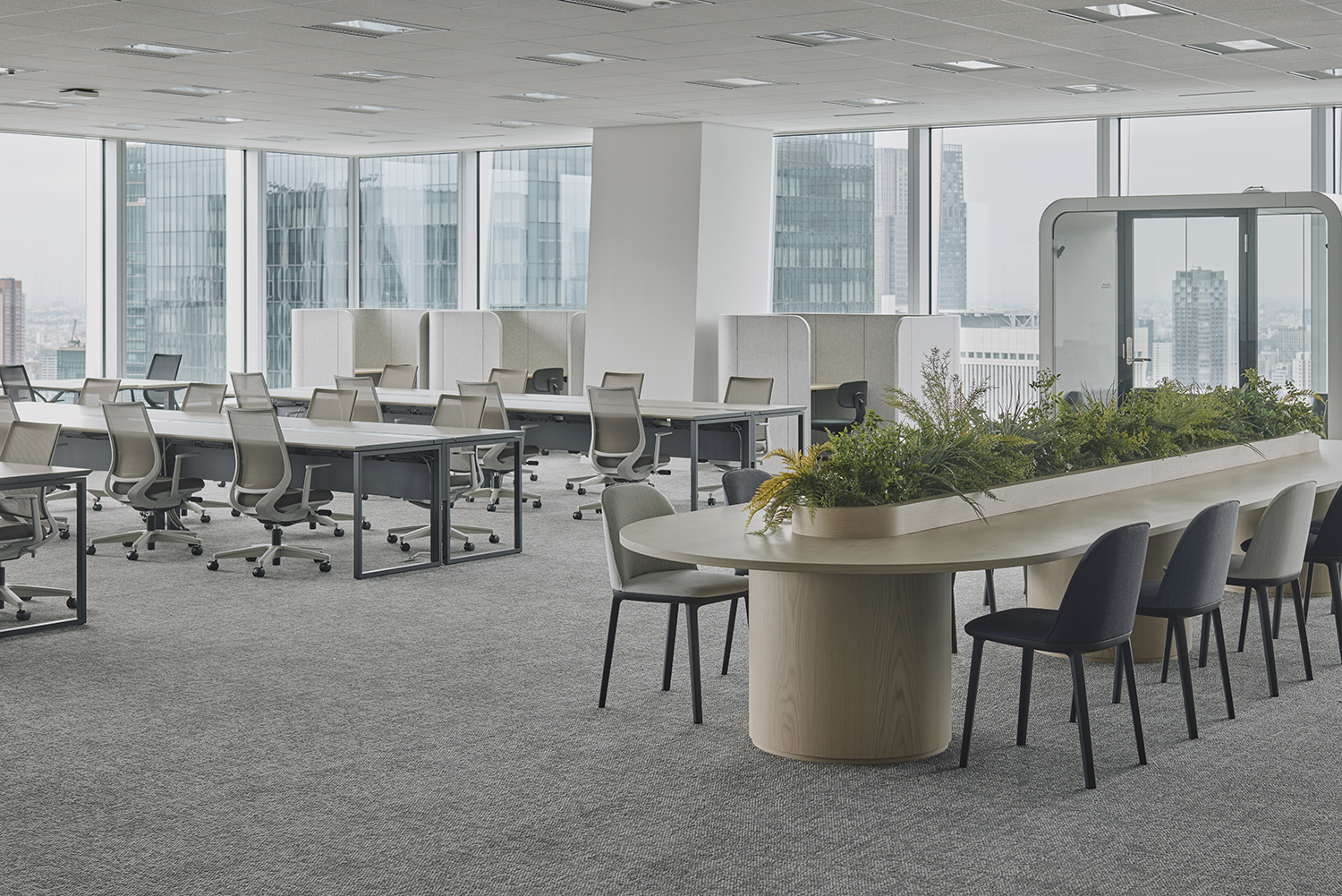 会議室中央にはプレゼンテーション兼デモンストレーションスペースを配置し、R形状の壁で緩やかに区切ることで回遊性のある動線を実現。エントランスからプレゼンスペース、デモスペース、そしてExecutive Briefing Center(EBC)ルームへとスムーズに誘導できるレイアウトとなっています。