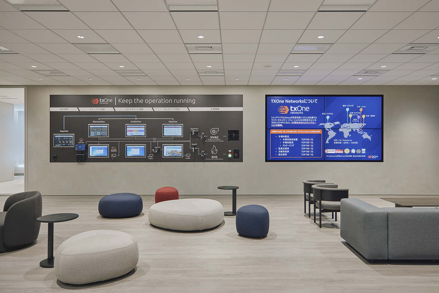 OT環境向けセキュリティソリューションを開発・提供する外資系企業、TXOne Networksの日本オフィス移転プロジェクト。新オフィスでは、クライアントとの接点を強化するため、来客エリアに「プレゼンスペース」と「デモスペース」を設置し、実際の機器やソリューションを体験できる場を提供しています。